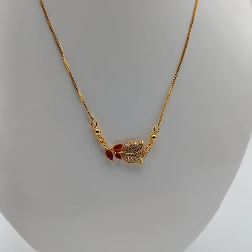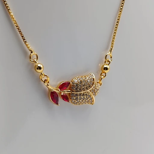 The Ruby Rose Petal Golden Pendant features a floral-inspired design with radiant ruby-red and clear zircon stones. Its elegant golden finish and refined chain make it a stunning piece for everyday elegance or special occasions.