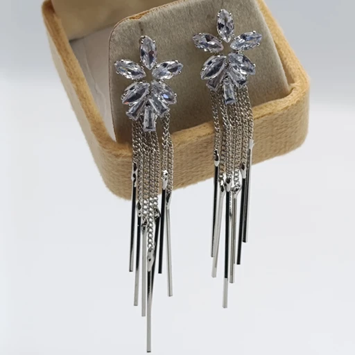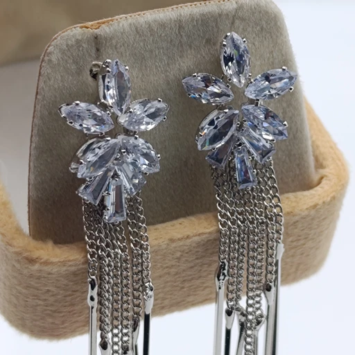 Elegant silver floral earrings adorned with sparkling zircon stones and delicate cascading chains. Perfect for weddings, special occasions, or adding a touch of refined glamour to any outfit.